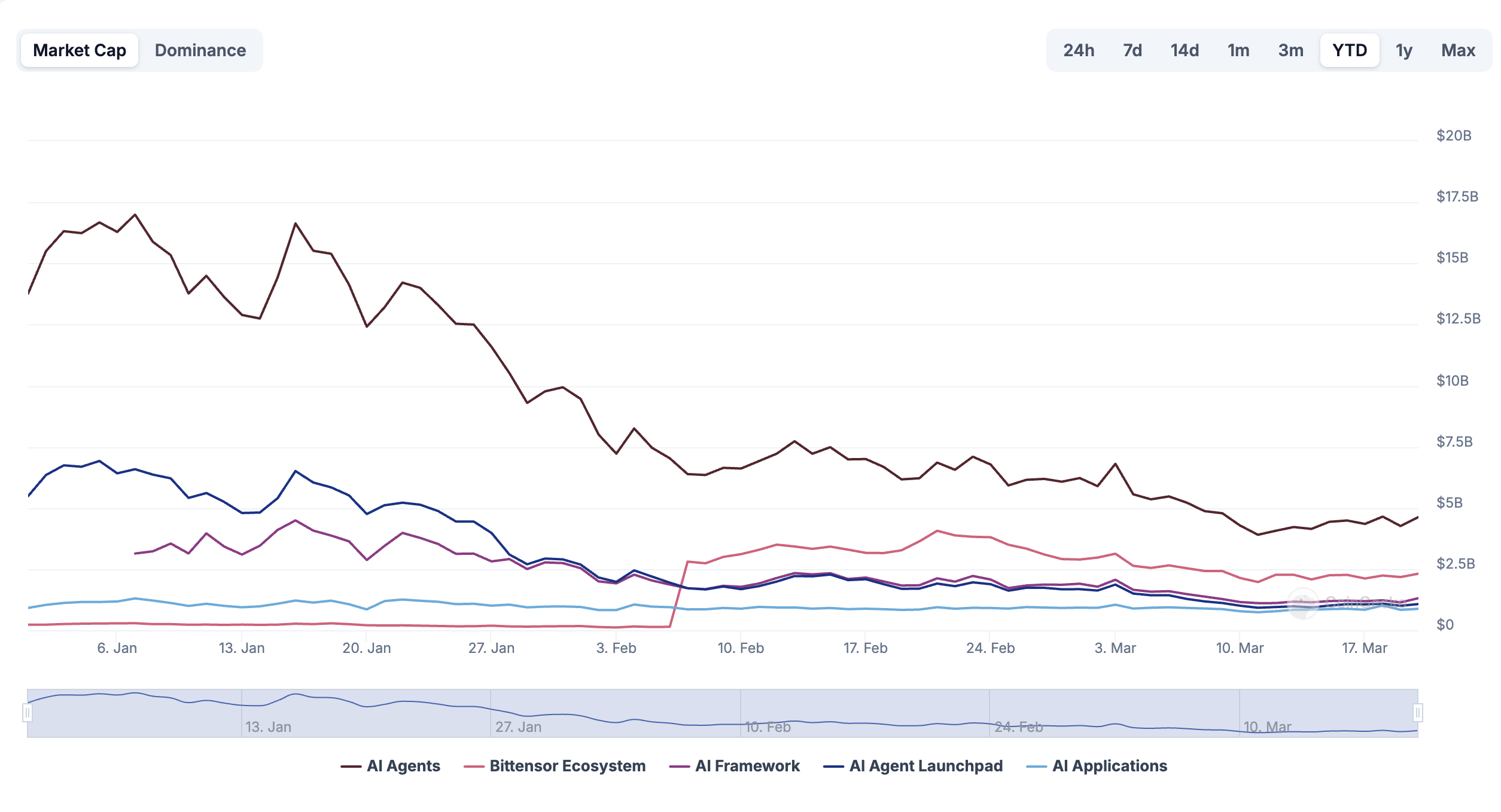 이전에 랠리를 촉발했던 주요 촉매제들이 최근에는 같은 모멘텀을 불러일으키지 못했습니다. 이는 엔비디아의 GTC 컨퍼런스 이후 AI 코인 시가총액이 하락한 것으로 나타났습니다.