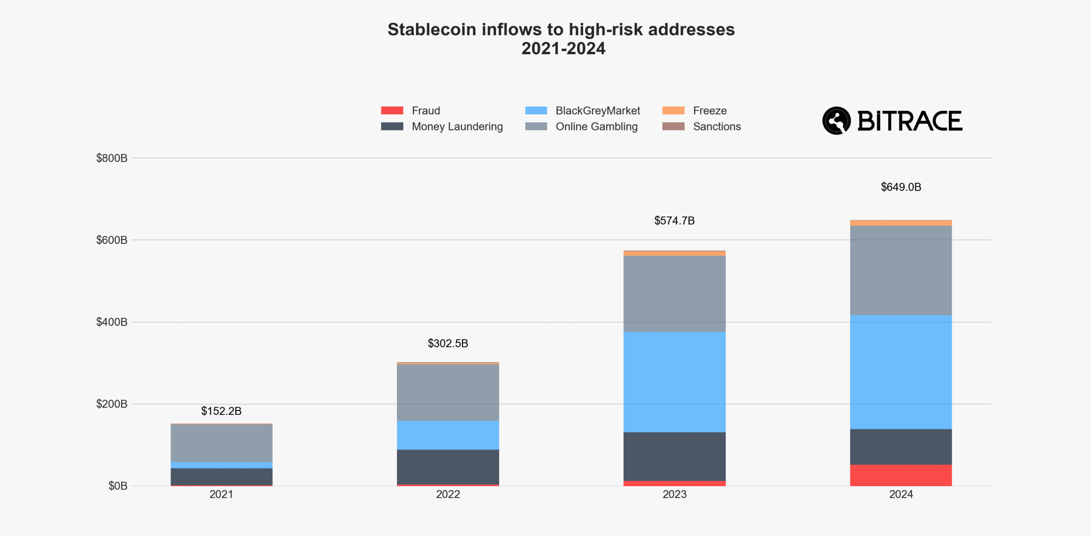비트레이스의 2024 암호화폐 범죄 보고서에 따르면, 범죄자들이 스테이블코인 6490억 달러를 고위험 주소로 이동했습니다. 스테이블코인의 사기 및 자금세탁 사용이 증가했지만, 합법적인 부문은 더 빠르게 성장했습니다.