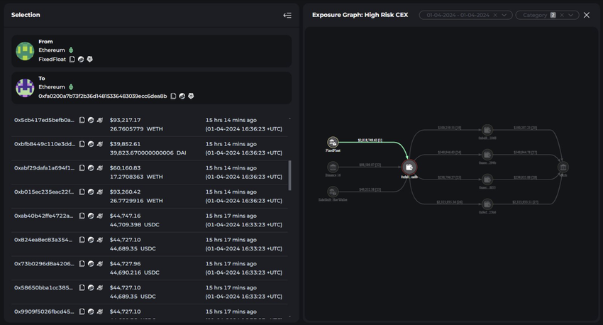 4월 2일에 발견된 FixedFloat의 사고는 ETH, USDT, WETH, DAI, USDC를 포함한 다양한 디지털 자산이 모호한 주소로 전송된 것과 관련이 있습니다. 악의적인 공격자들은 탈중앙화 거래소(DEX)를 통해 이러한 자산을 신속하게 이더리움으로 전환한 후 전량을 eXch로 옮겼습니다.