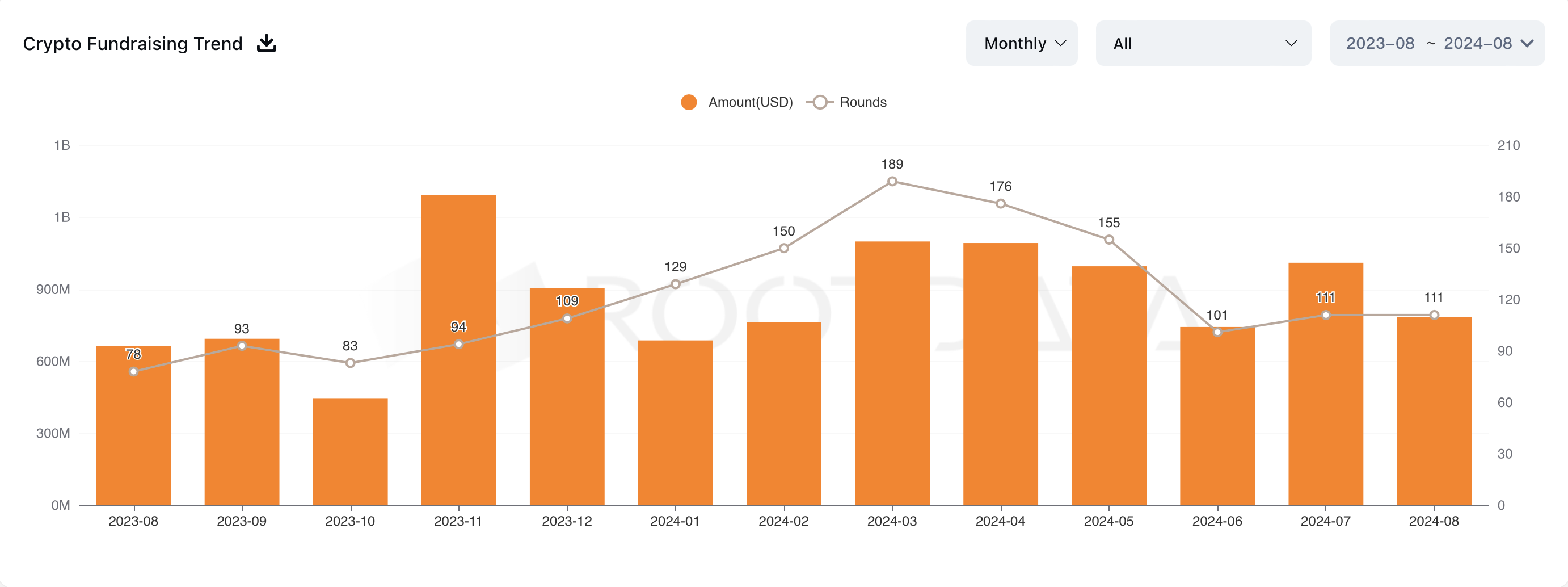 RootData 통계에 따르면 2024년 8월에는 공개된 암호화폐 VC 투자 프로젝트가 111건으로 7월과 동일합니다. 이는 2023년 8월에 기록된 78건에 비해 41% 증가한 수치입니다.