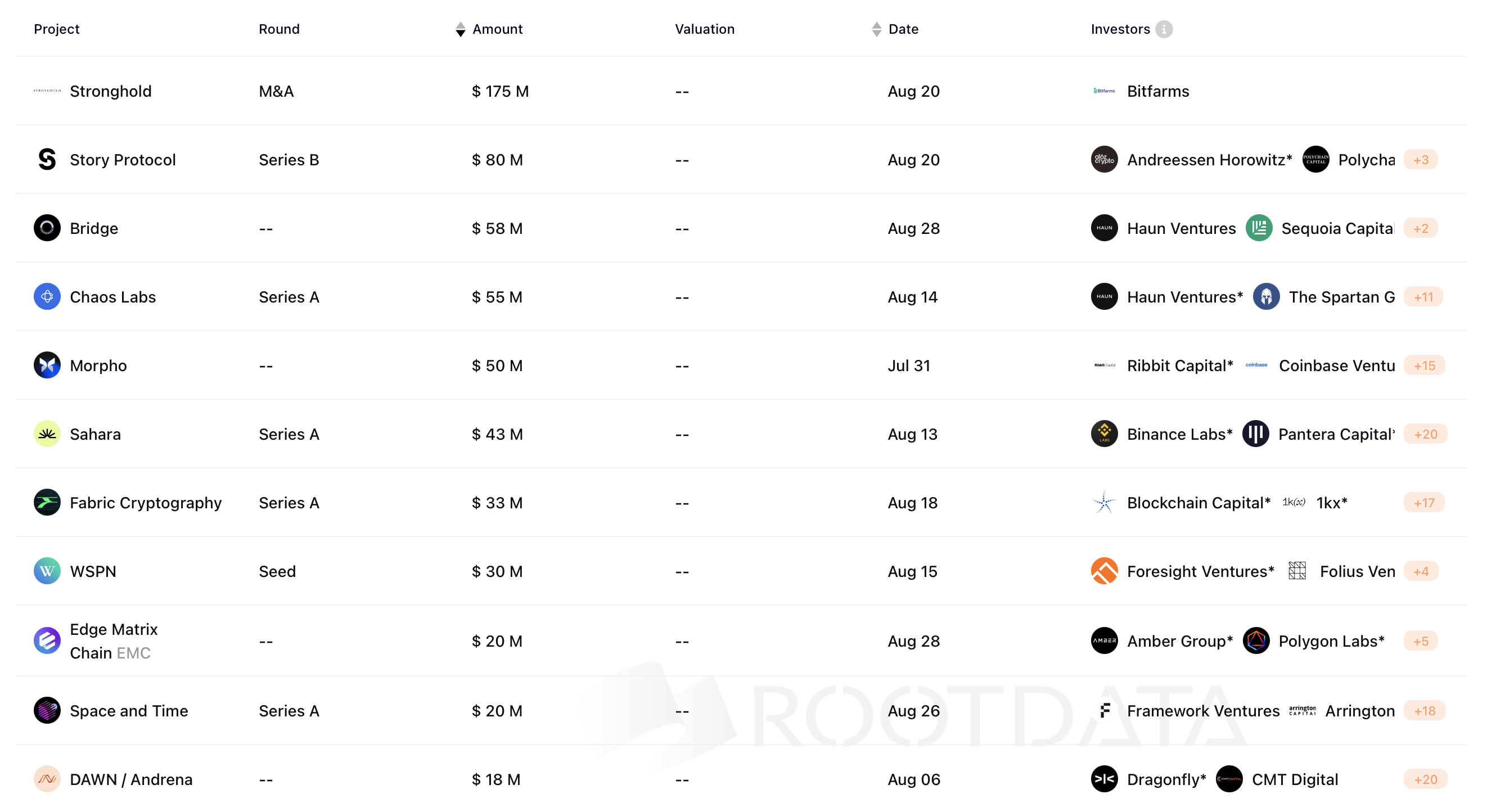 8월에 주목할 만한 다른 펀딩 라운드로는 Chaos Labs가 DeFi 위험 관리를 위해 5500만 달러를 모금했으며, Morpho는 인터넷 인프라에 DeFi를 통합하기 위해 5000만 달러를 확보했습니다. Sahara AI는 AI 주권을 강화하기 위해 4300만 달러를, Fabric Cryptography는 암호화 하드웨어 개발을 위해 3300만 달러를 모금했습니다.
