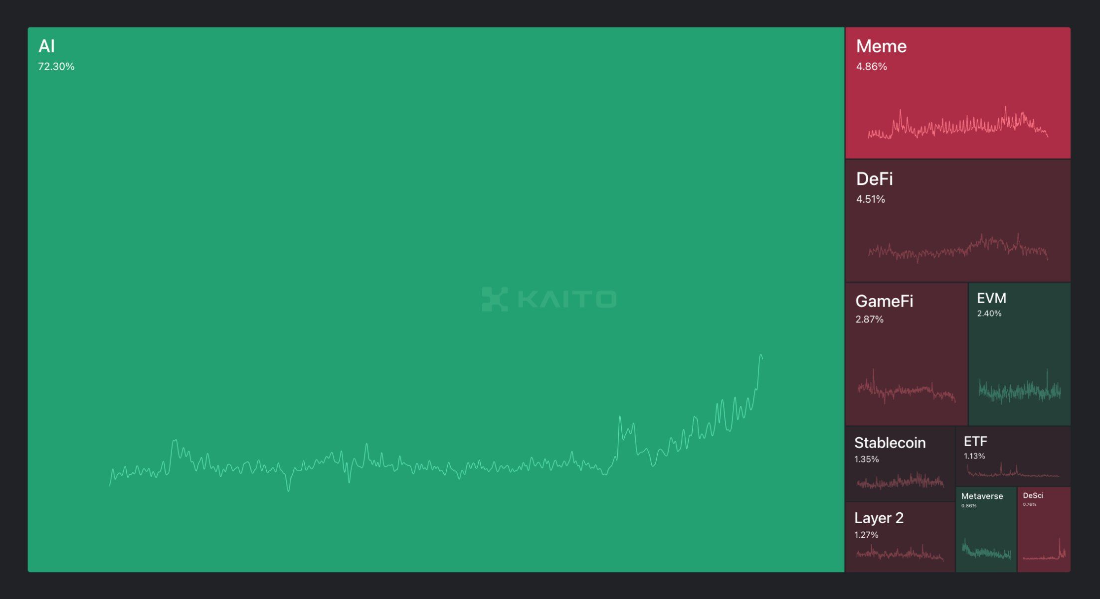 Kaito의 데이터에 따르면, AI는 암호화폐에서 72%의 압도적인 주목을 받고 있으며, 밈, 게임파이, 디파이와 같은 다른 부문을 크게 앞서고 있습니다. 이는 Sam Altman의 최근 AGI 발표 이후 AI 관련 프로젝트에 대한 열정과 투자가 증가한 결과입니다. 이러한 광범위한 관심은 AI 코인이 시장 내러티브에서 지배력을 유지할 가능성을 보여줍니다.