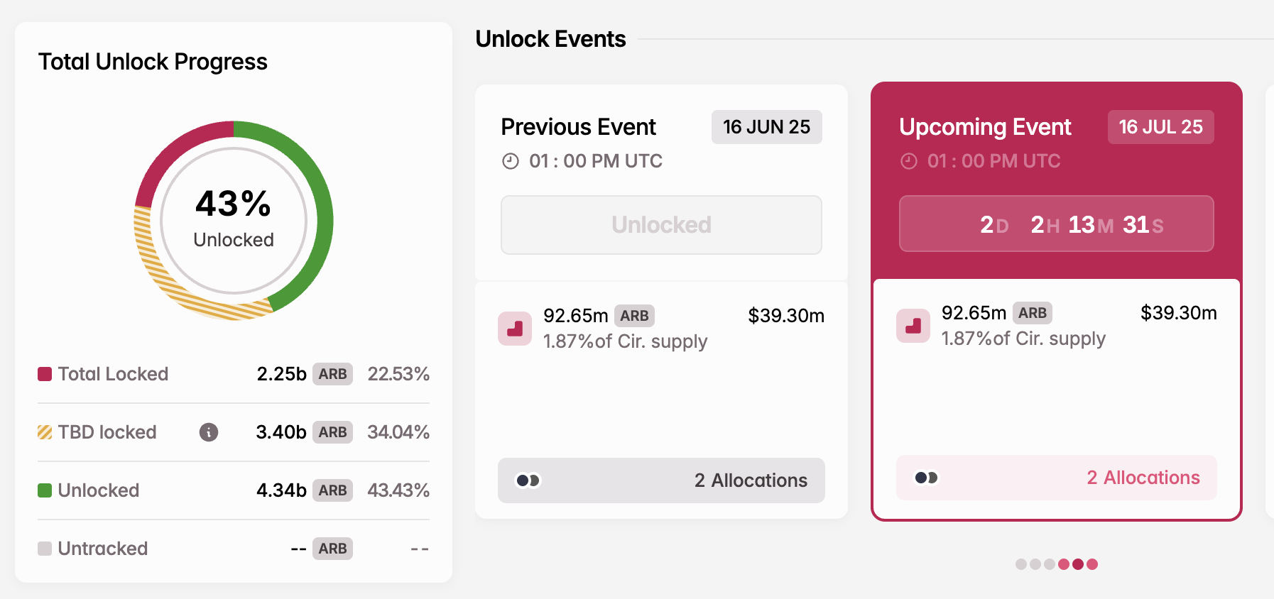 - 언락될 토큰 수: 9265만 ARB (총 공급량의 0.93%)