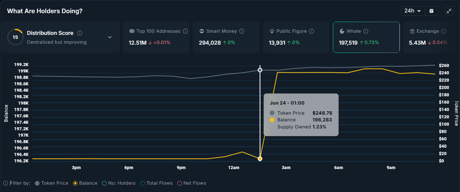 AERO는 UNI와 유사한 고래 활동을 경험했으며, 고래들이 점진적으로 자산을 축적하고 있습니다. 24시간도 채 되지 않아 200만 AERO 이상, 160만 달러 이상의 가치가 매수되었습니다. 이 축적은 대형 투자자들의 관심이 증가하고 있음을 나타내며, AERO의 가격 움직임에 긍정적인 분위기를 조성합니다.
