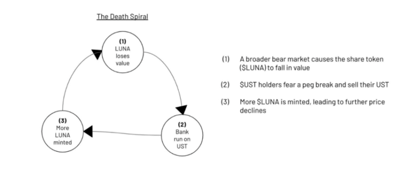 그러나 UST의 페깅이 일탈하고 그 가치가 USD 가치 아래로 떨어지면서 사용자들은 손실을 피하기 위해 UST를 매도하는 데스 스파이럴이 발생했다. 이로 인해 UST의 가치는 더 떨어졌고, 프로토콜은 페깅을 유지하기 위해 담보로 초과 LUNA를 발행했다.