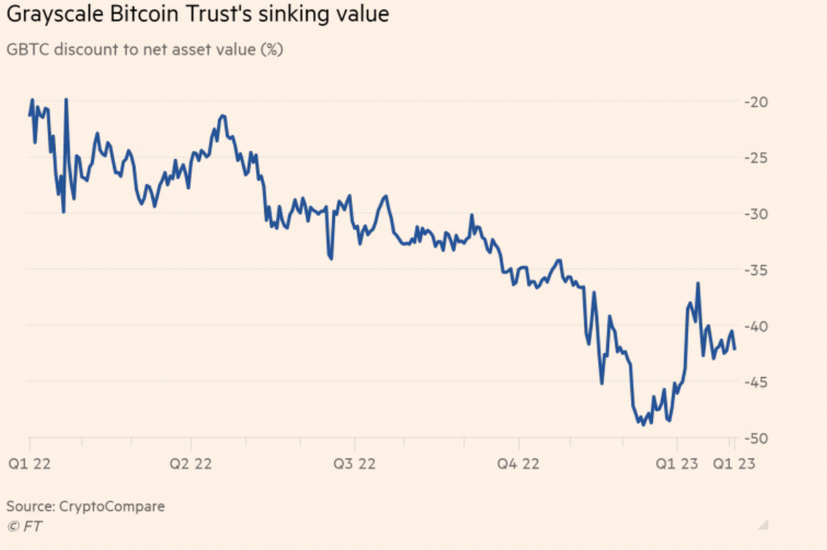 그레이스케일의 그레이스케일 비트코인 트러스트(GBTC) 운용자산 규모는 145억달러가 넘는다. 그러나 암호화폐 시장 침체기를 겪으면서 GBTC는 기초자산인 비트코인과 비교해 할인된 가격에 거래되고 있다.