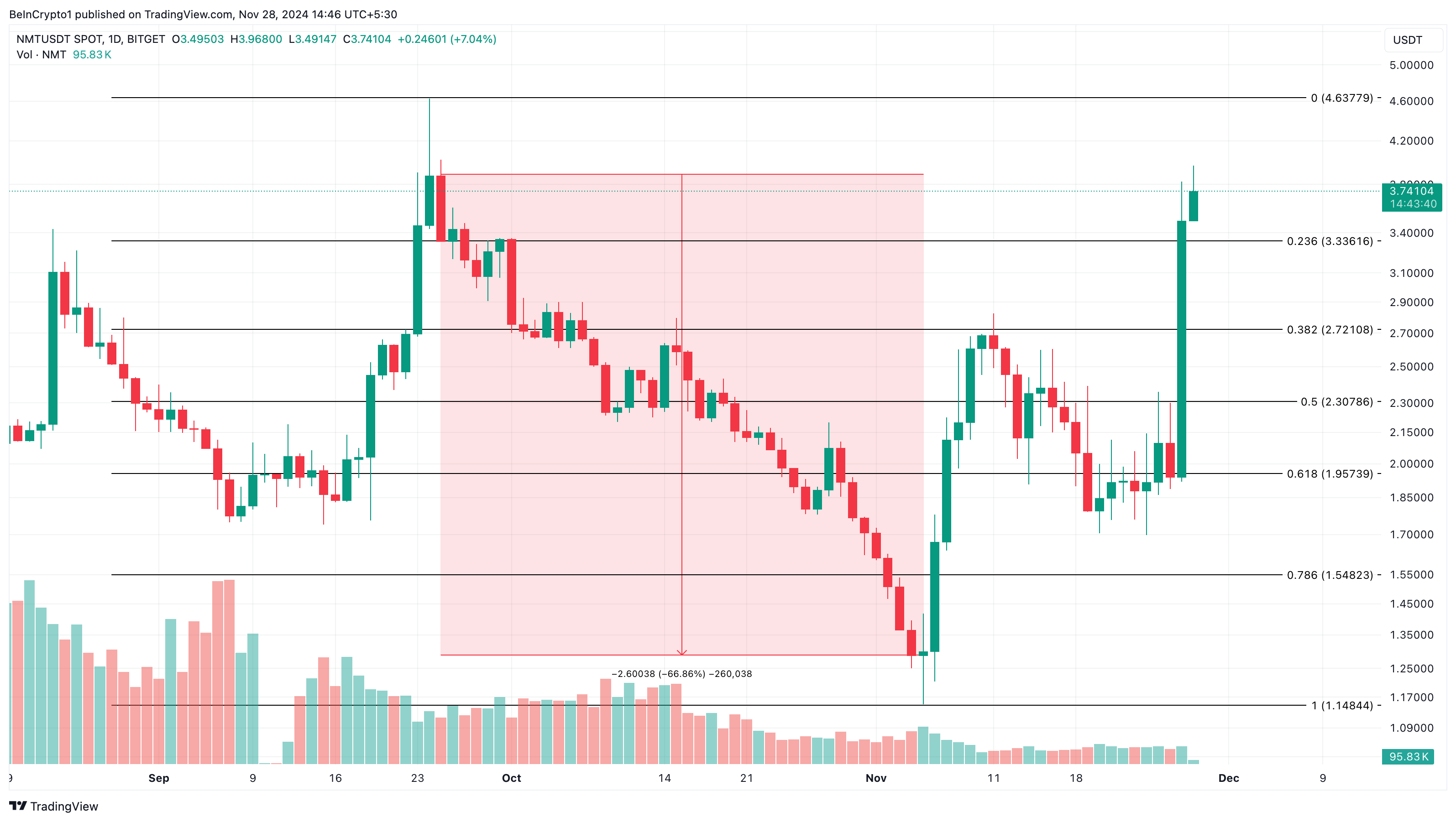 이 거래량 급증은 토큰에 대한 관심이 증가하고 있음을 나타냅니다. NMOR의 가치는 어제보다 76.10% 증가했습니다. 9월 25일부터 11월 5일까지 NetMind Token의 가격은 3.89달러에서 1.29달러로 하락했습니다.