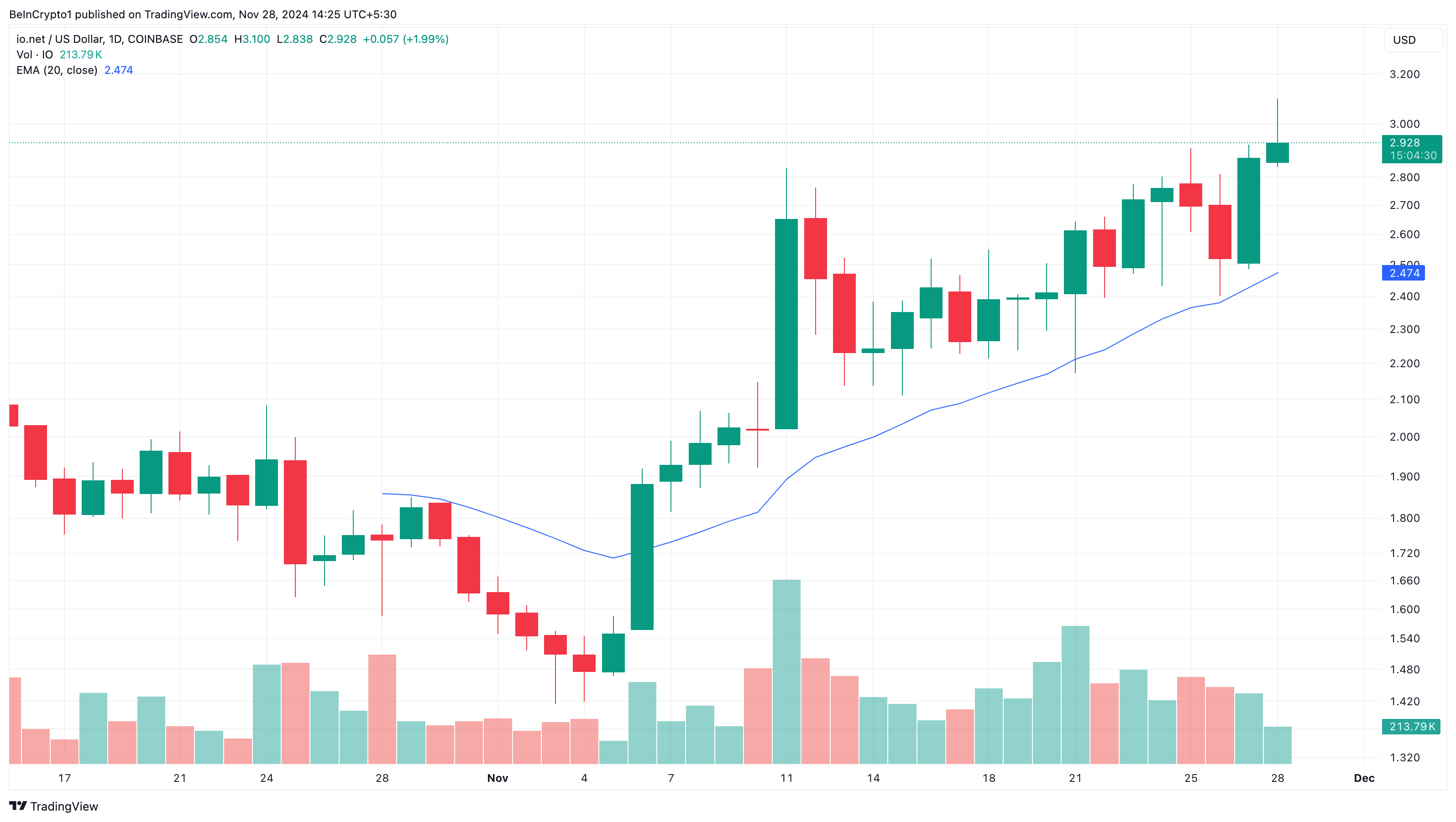 일일 차트에서 IO의 가격은 20일 지수 이동 평균(EMA) 위로 상승했습니다. 이 위치는 알트코인 주위의 추세가 강세임을 의미하며, 가격이 계속 상승할 수 있음을 나타냅니다.