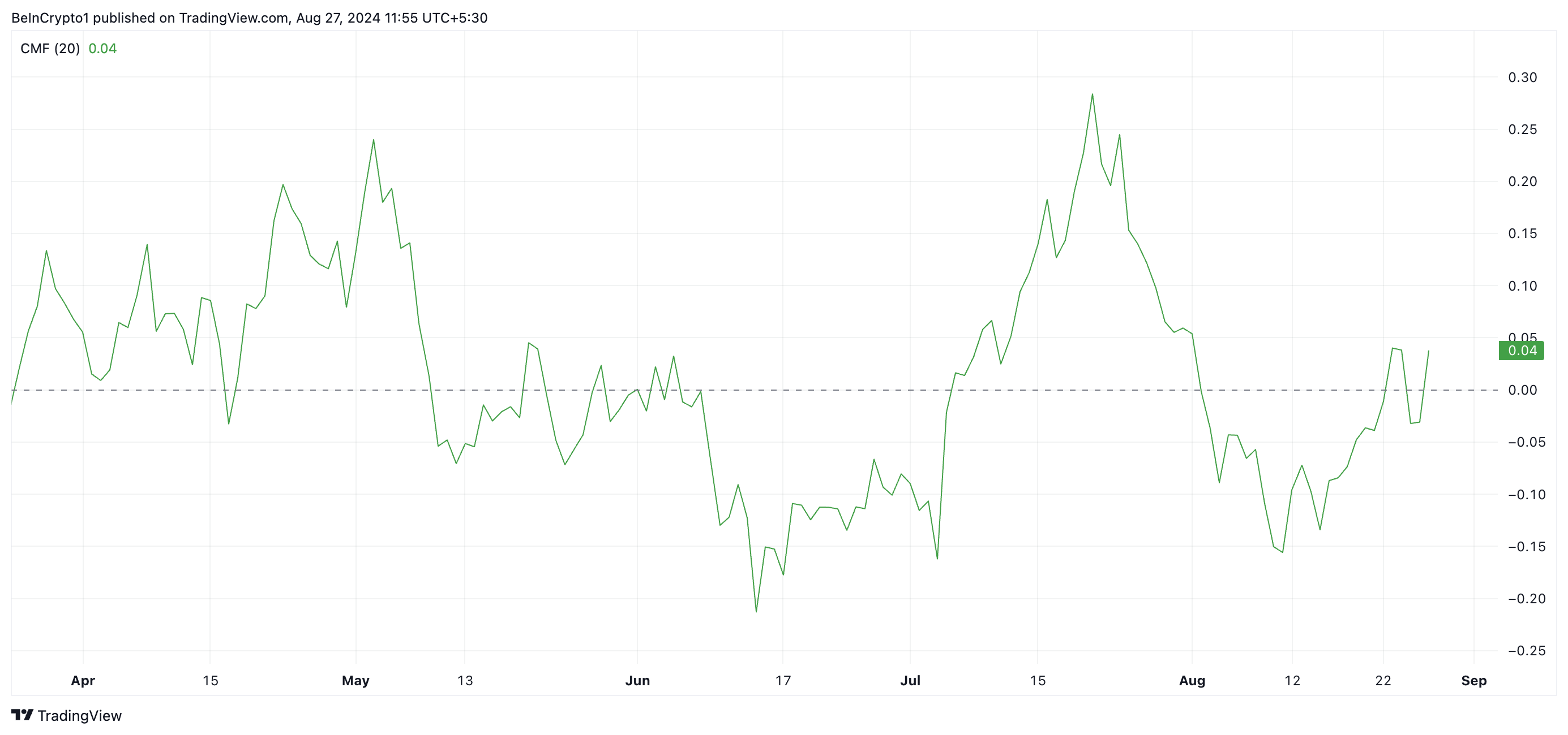 그러나 DOGE의 차이킨 머니 플로우(CMF) 지표는 하락세가 끝나가고 있을 수 있음을 시사합니다. 이 모멘텀 지표는 상승세를 시작하여 제로 라인을 넘어섰습니다. 현재 DOGE의 CMF는 0.04입니다.
