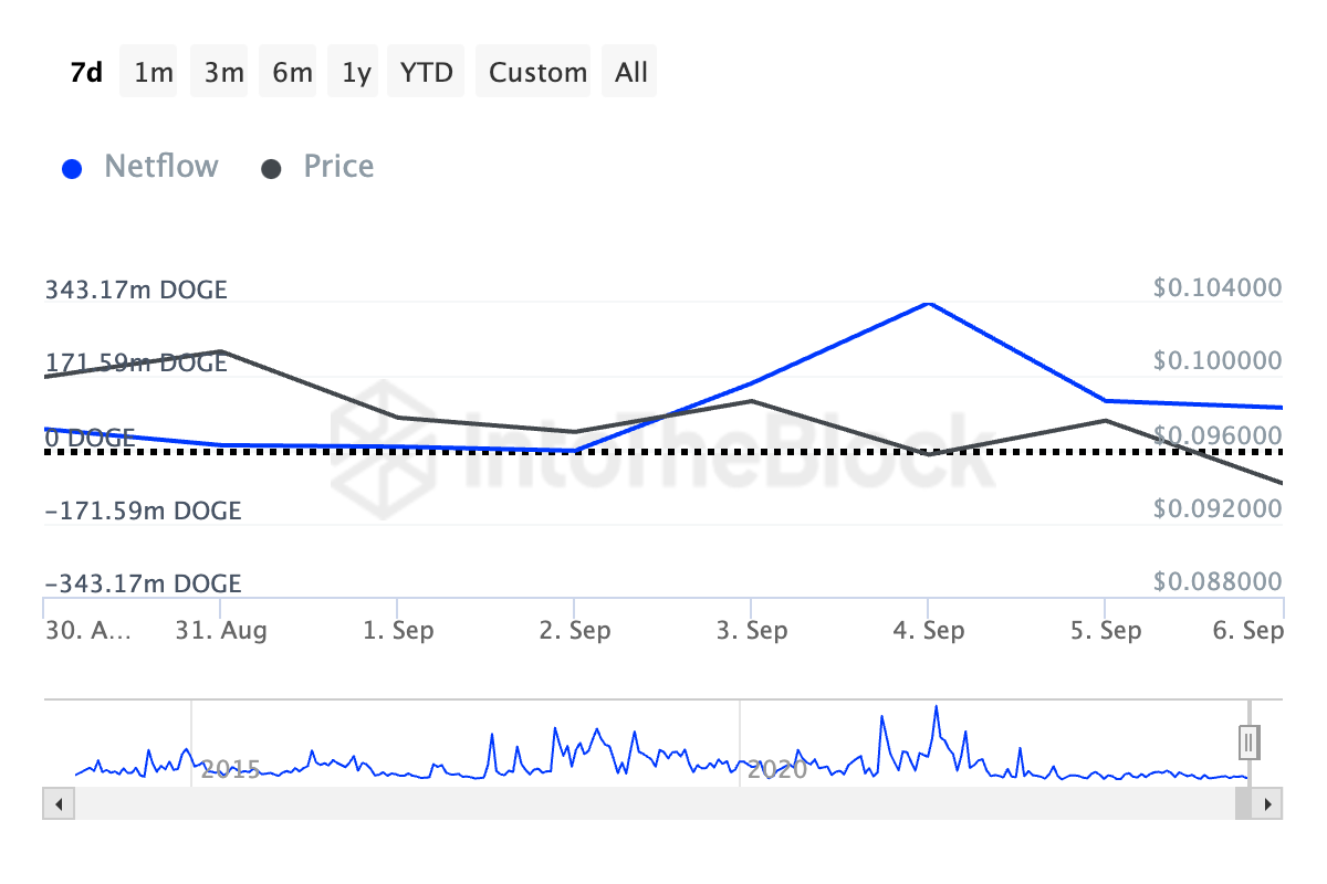 DOGE의 큰 보유자들, 즉 유통량의 0.1% 이상을 제어하는 고래 주소들은 가격 변동에서 중요한 역할을 합니다. 그들의 순유입은 시간에 따른 매수와 매도의 차이를 추적하며 주요 통찰력을 제공합니다. 순유입의 급증은 이러한 고래들의 증가된 적립을 나타내며, 종종 소매 투자자들이 따라가는 것은 일반적으로 긍정적인 지표입니다.
