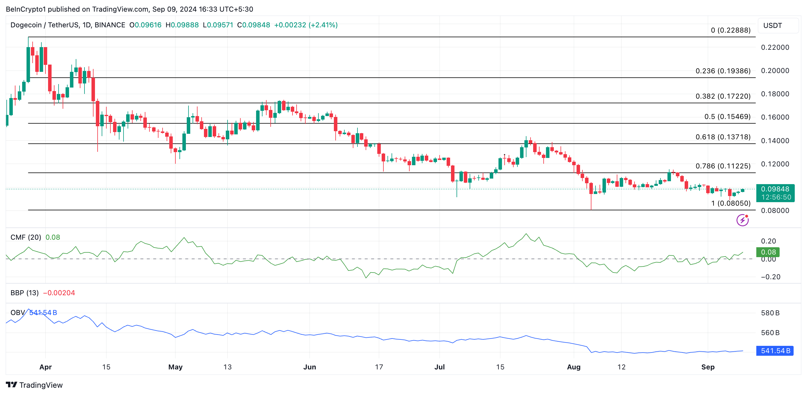 도지코인의 상승하는 가격은 시장으로의 자금 유입을 측정하는 Chaikin Money Flow (CMF)의 급등에 의해 지지됩니다. 현재 0.08의 상승 추세에 있는 긍정적인 CMF는 매수 압력이 매도 활동을 초과함을 나타냅니다. CMF가 상승함에 따라, 구매 동력이 강화되어 도지코인의 상승세를 지속할 수 있습니다.