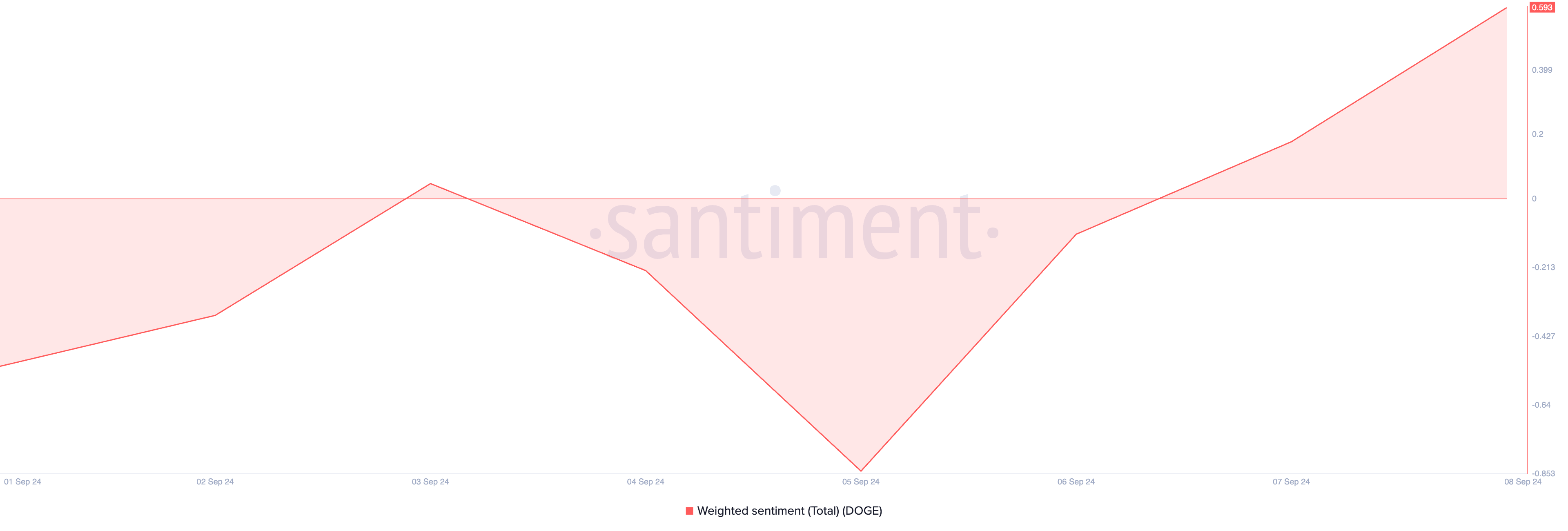 엘론 머스크의 게시글 이후, DOGE의 가중 감정은 부정적에서 긍정적으로 변했습니다. 암호화폐 온라인데이터 플랫폼인 센티멘트(Santiment) 데이터에 따르면, 현재 DOGE의 가중 감정은 0.59로, 낙관적인 분위기를 반영합니다.