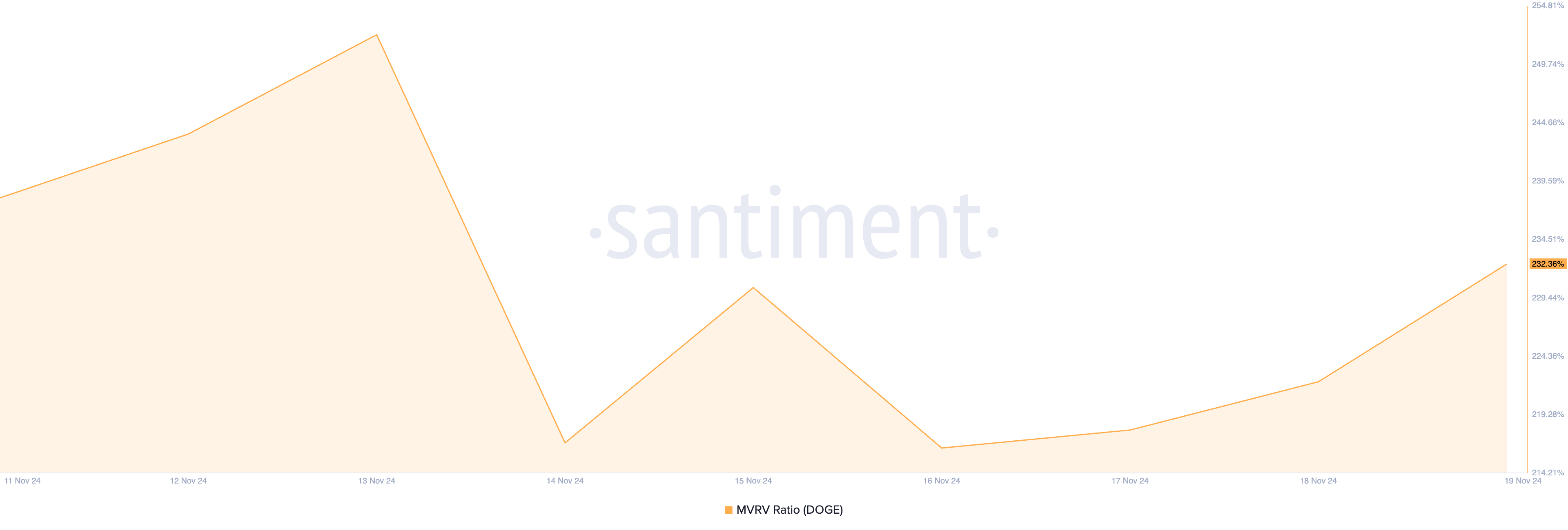 또한 도지코인의 시장 가치 대 실현 가치(MVRV) 비율에서 나타난 긍정적인 수치는 밈코인이 현재 고평가되어 있다는 것을 시사합니다. 이는 장기 보유자들이 이익을 위해 판매하고자 하는 원인이 될 수 있습니다. 센티멘트의 데이터에 따르면 현재 도지코인의 MVRV 비율은 232.36%입니다.