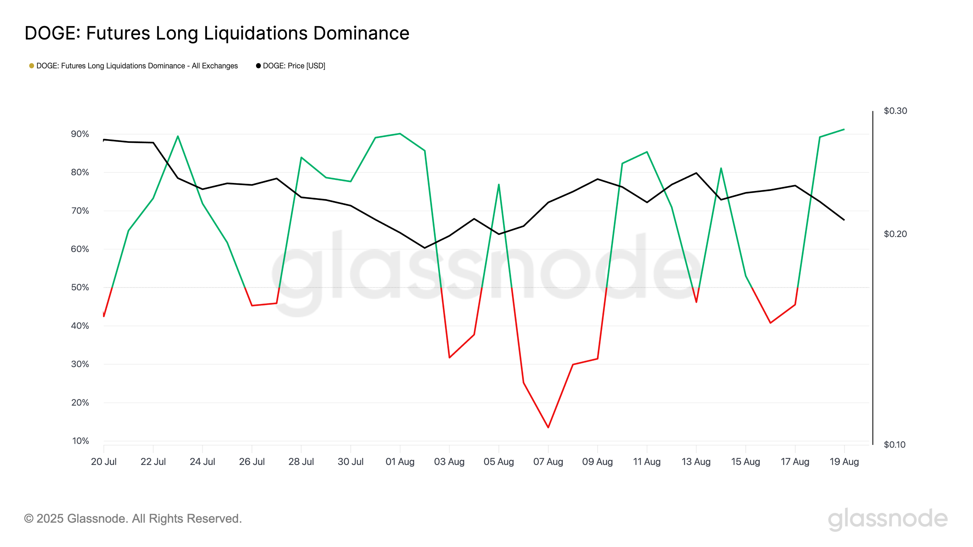 어제 DOGE 선물 롱 청산 지배율은 98%로 상승하여 대부분의 청산된 포지션이 롱 베팅임을 나타냈습니다.