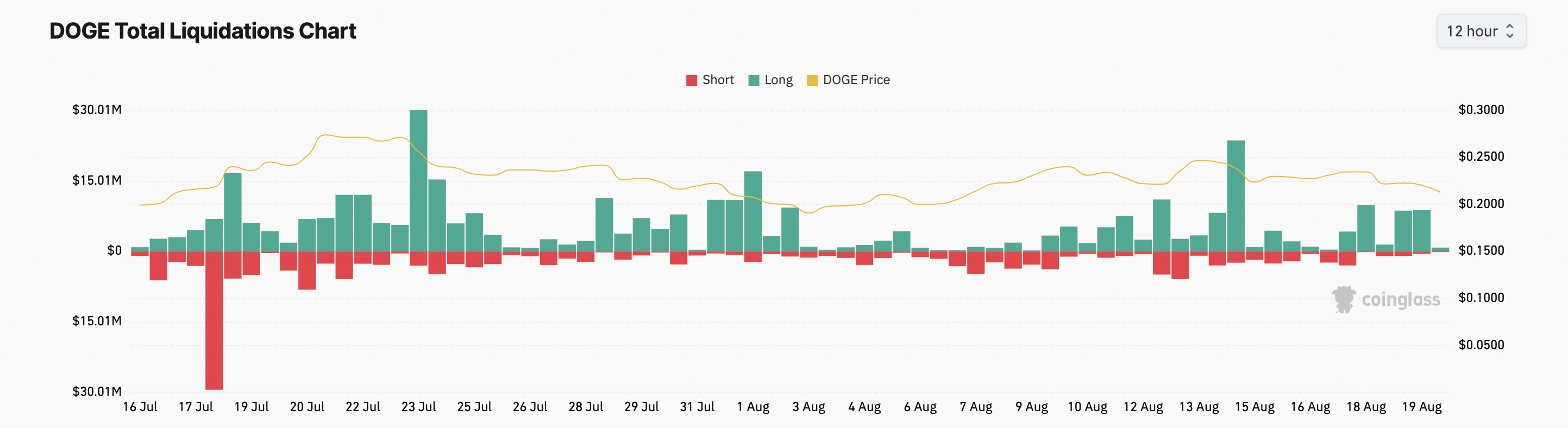 DOGE의 최근 가격 하락은 더 넓은 시장의 하락으로 인해 악화되었으며, 선물 시장에서 롱 청산의 물결을 일으켰습니다. 코인글래스(Coinglass)에 따르면, 지난 24시간 동안 밈코인의 하락세가 이어지면서 총 1천만 달러의 롱 청산이 발생했습니다.