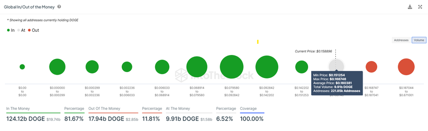 15억 6천만 달러 이상의 가치가 있는 이 물량은 0.151달러에서 0.168달러 사이에 매수되었습니다. 현재 DOGE는 이 범위의 상한선보다 6% 낮은 가격에 불과하며, 이는 이 공급량이 수익성이 있다는 것을 의미합니다.