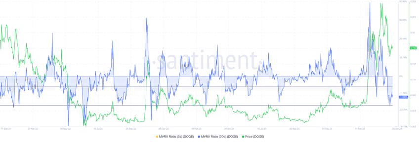이러한 분위기를 뒷받침하는 것은 도지코인의 시장가치 대비 실현가치(MVRV) 비율입니다. MVRV는 투자자가 부담하는 전체 수익과 손실을 평가하는 데 사용됩니다. 도지코인의 30일 MVRV가 -14%라는 점을 감안하면 투자자는 매월 손실을 보고 있는 것입니다.