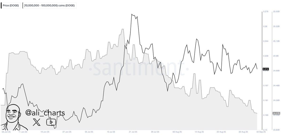 Sponsored다른 한편으로, Ali는 고래들이 48시간 내에 약 2억 DOGE를 매도한 것으로 보인다고 관찰했습니다. 이는 일부 대형 지갑이 이탈하는 반면, 기술적 수요가 나타나는 분열된 시장 상태를 반영합니다.