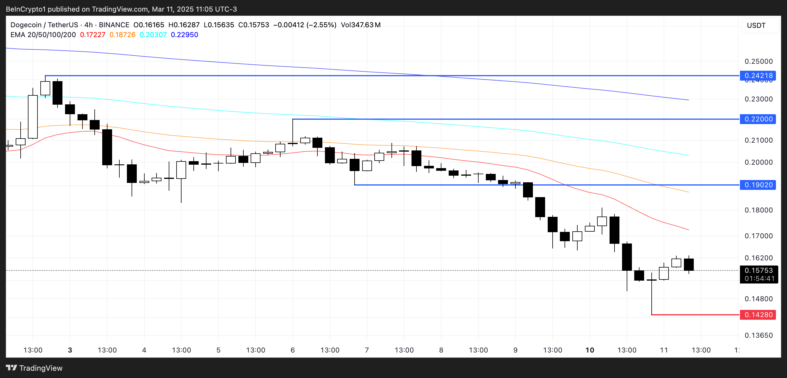 하락세가 지속되면 DOGE는 곧 0.142달러의 지지선을 테스트할 수 있습니다. 이 수준 아래로 떨어지면 2024년 10월 이후 처음으로 0.14달러 아래로 밀릴 수 있습니다. 그러나 밈코인에 대한 높은 관심이 다시 나타나고 매수 압력이 돌아오면 DOGE는 회복을 시도할 수 있습니다. 0.19달러와 0.22달러의 주요 저항 수준이 잠재적인 추세 반전을 막고 있습니다.