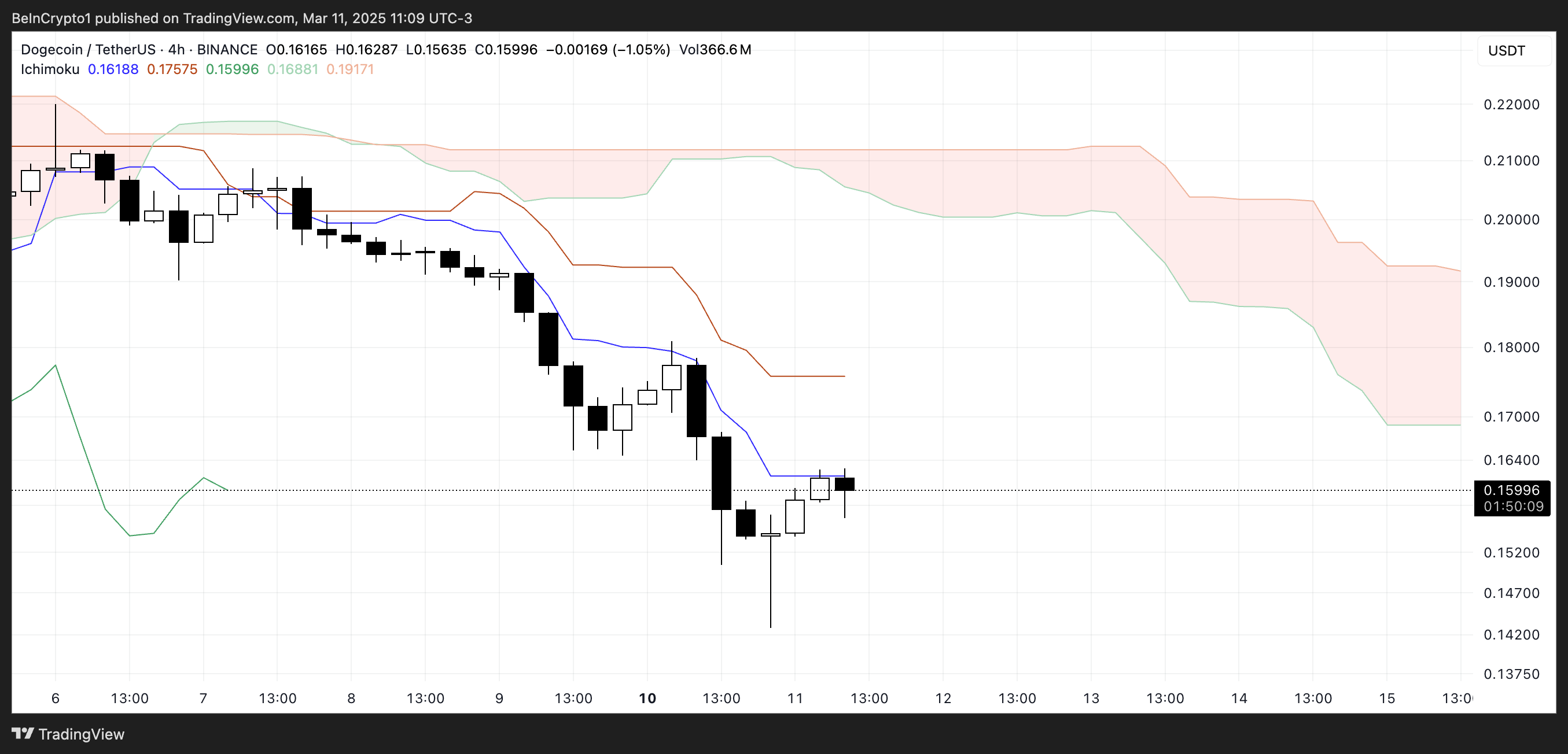 도지코인의 일목균형표 차트는 강한 하락세 설정을 보여줍니다. 가격은 파란색 전환선과 빨간색 기준선 아래에서 거래되고 있습니다.