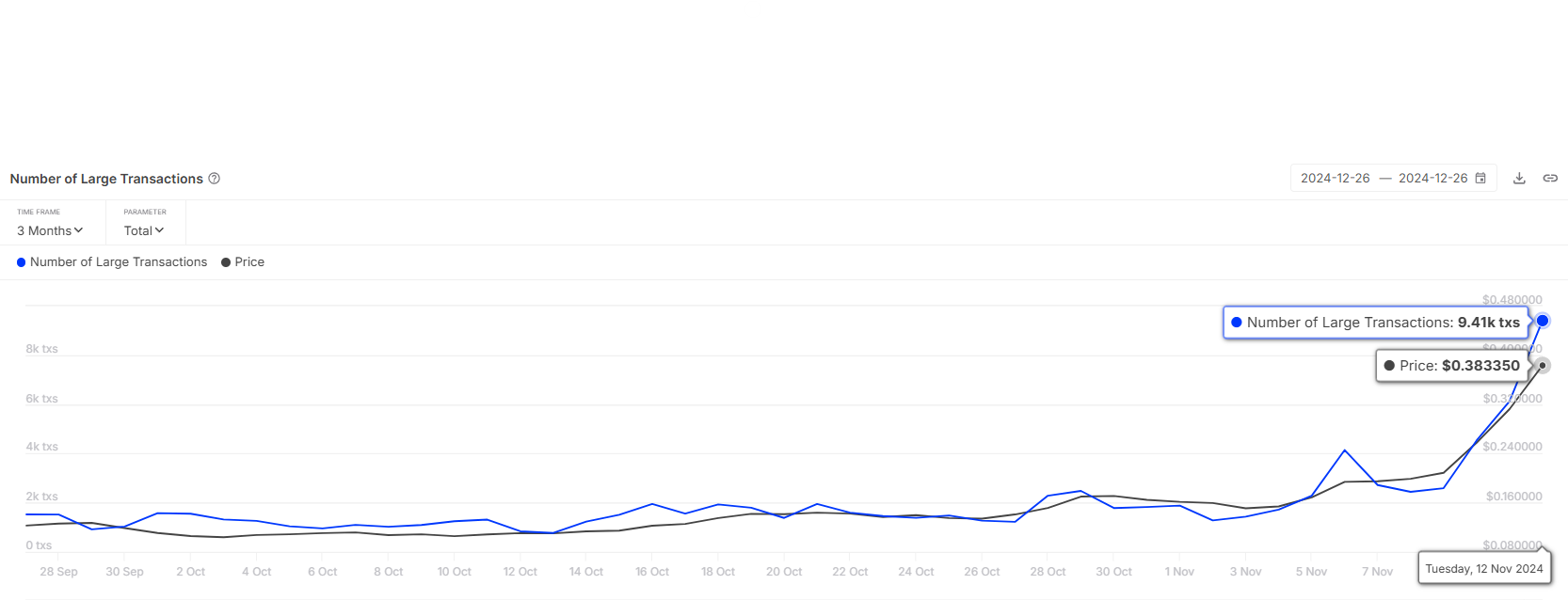 도지코인 고래들은 알트코인의 추가 하락을 막는 데 중요한 역할을 합니다. 10만 달러를 초과하는 거래가 급증하여 9410건에 이르렀으며, 이는 2021년 11월 이후 최고 수준입니다. 이러한 고액 거래의 부활은 강력한 고래 활동을 나타내며, 이는 변동성이 큰 시기에 도지코인을 안정화하는 데 역사적으로 중요한 역할을 했습니다.