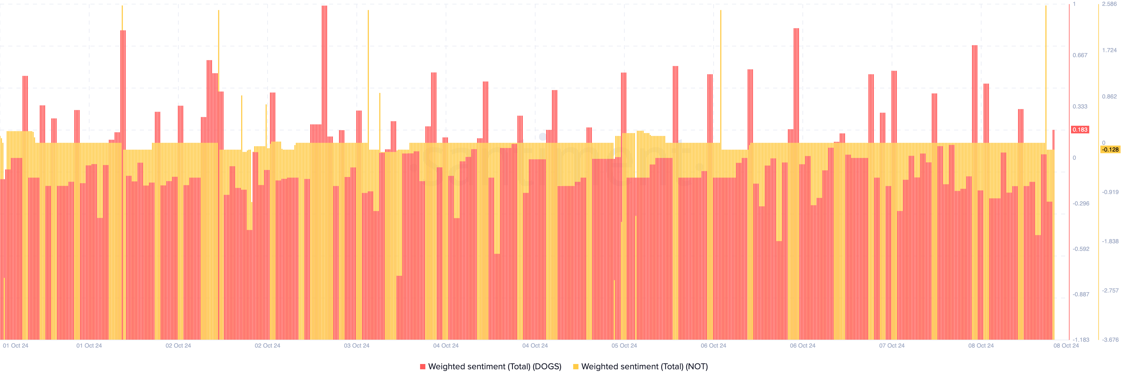 현재 DOGS는 출시 가격보다 55% 하락한 0.00072달러에 거래되고 있습니다. 낫코인의 가격은 사상 최고가 대비 46% 하락했습니다. 이에도 불구하고 프로젝트에 대한 가중 감정이 상승했으며, 이는 커뮤니티가 이벤트에 대해 긍정적이라는 것을 시사합니다.