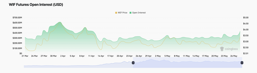 WIF의 선물 미청산계약은 지난 주에 크게 상승했습니다. 보도 시점에 4억 3,400만 달러였던 밈 코인의 선물 미결제약정은 지난 7일 동안 38%나 급증했습니다.