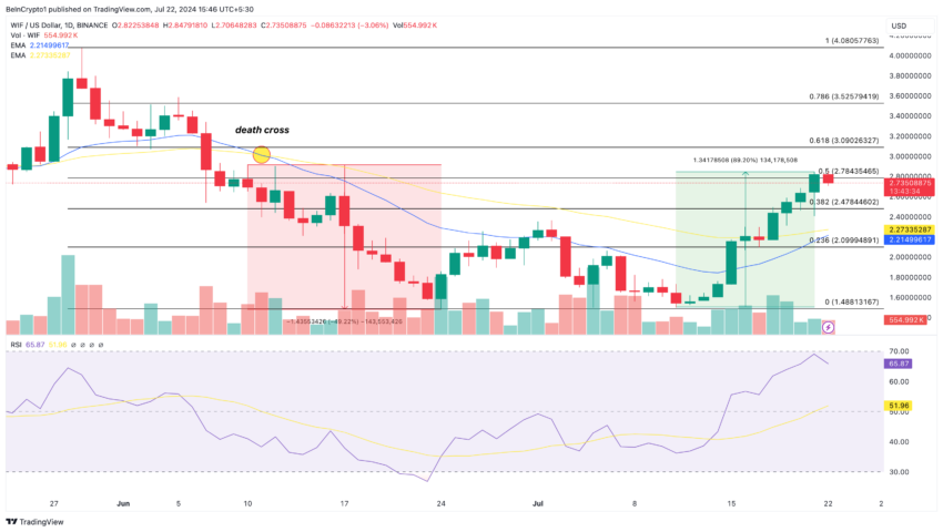 일봉 차트에서 WIF는 6월 10일 데스 크로스를 형성했고, 6월 14일까지 가격이 거의 50% 하락했습니다. 참고로 데스 크로스는 더 긴 EMA가 더 짧은 EMA를 교차할 때 발생합니다.