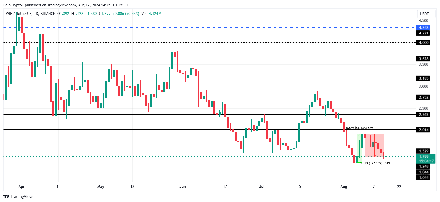 WIF 가격은 현재 1.39달러에거래되고 있으며, 지난 7일 동안 27% 하락했습니다. 이러한 하락으로 8월 초 3일 동안 51% 상승했던 랠리가 거의 사라졌습니다. 이러한 하락의 결과로 밈 코인은 상승 추세를 기록할 수 있는 잠재력을 잃었습니다.