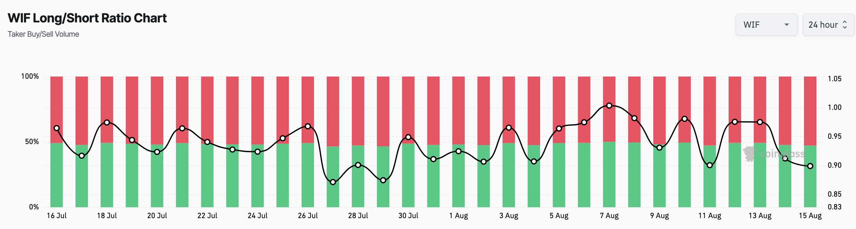 또한 시장의 트레이더들도 비슷한 감정을 공유하고 있는 것으로 보입니다. 코인글래스에 따르면, WIF 롱/숏 비율은 0.89까지 하락했습니다. 이 비율은 파생상품 시장에서 매수(매수자)와 매도(매도자)의 포지션을 분석합니다.
