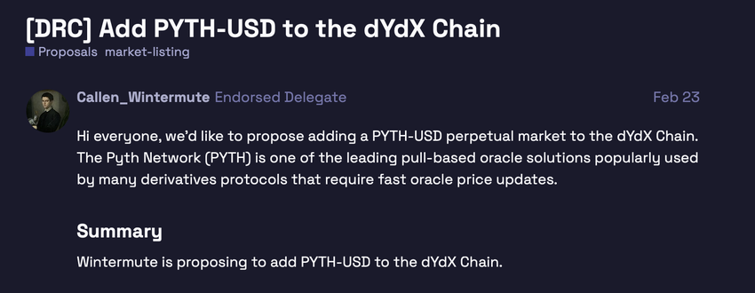 2024년 dYdX 트레이딩의 제품 로드맵에 명시된 대로 올해 말에는 거버넌스 투표 없이 완전히 허가 없이 새로운 시장을 만들 수 있는 오픈 소스 소프트웨어가 도입될 예정입니다. 이를 통해 모든 당사자는 거버넌스 투표를 통한 승인 없이도 오라클 시장 매개변수를 지정하고 잠재적으로 초기 유동성을 제공하여 새로운 시장을 만들고 출시할 수 있게 될 것입니다.