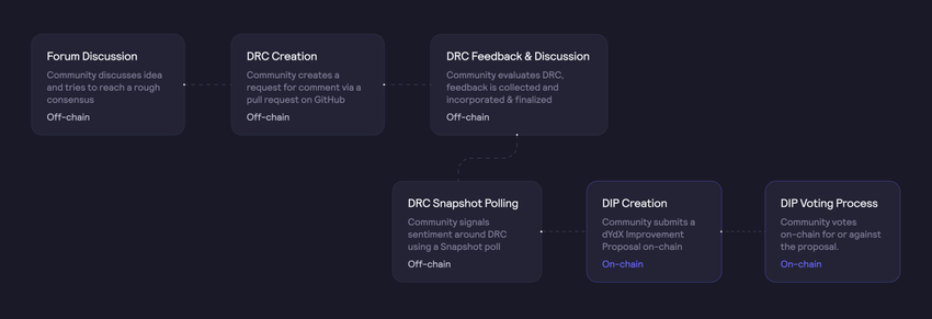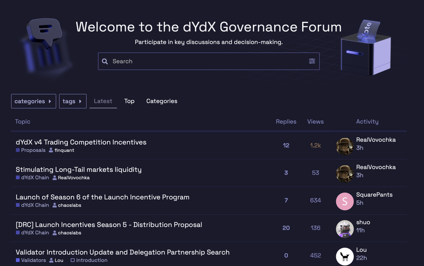 - 대부분의 제안은 커뮤니티 구성원이 피드백을 제공하고 토론에 참여할 수 있는 dYdX 포럼에 게시됩니다. 이 플랫폼은 열린 대화를 지원하여 사용자가 자신의 관점과 통찰력을 공유할 수 있도록 합니다. 이 포럼은 커뮤니티 참여의 허브 역할을 하여 모든 사람이 거버넌스 프로세스에서 발언권을 가질 수 있도록 합니다.