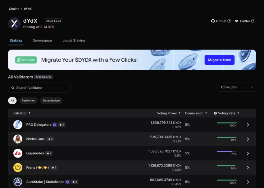 DYDX 토큰을 스테이킹하면 네트워크를 보호하고 안정화하며, 스테이커에게 주어지는 프로토콜 수수료의 100%를 USDC로 분배받을 수 있습니다. 현재까지 총 DYDX 토큰 공급량의 15%(1억 5,300만 개) 이상이 락업되어 dYdX 체인을 보호하고 있습니다. 검증자를 선택할 때는 성실한지, 믿을 수 있는지 등을 잘 확인해봐야 하고, 고급 스테이킹 전략을 사용하는 경우에는 그에 따른 위험을 충분히 이해해야 합니다.