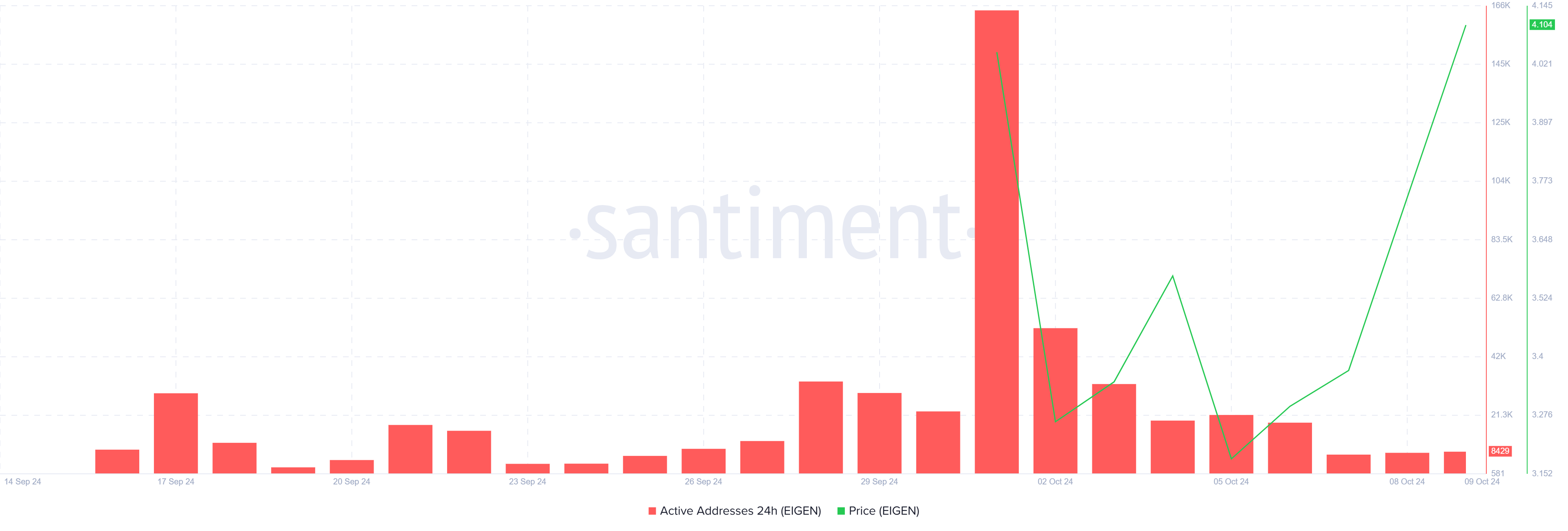 예상되는 가격 상승은 네트워크 활동의 하락 추세를 반전시킬 수 있습니다. EIGEN의 가격이 상승함에 따라 더 많은 보유자들이 다시 참여하도록 격려받을 수 있으며, 이는 활성 주소의 증가로 이어질 수 있습니다. 이는 토큰의 시장 위치를 더욱 공고히 하고 투자자 신뢰를 강화할 것입니다.