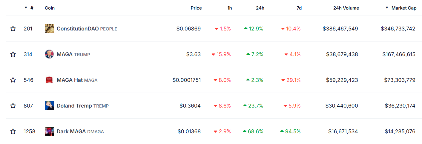 시가총액 기준 상위 5개 정치 밈코인은 모두 지난 24시간 동안 상승했으며, 대부분이 트럼프와 관련되어 있습니다. 반면, 지난 24시간 동안 가장 큰 하락을 보인 정치 밈코인은 해리스와 관련되어 있습니다.