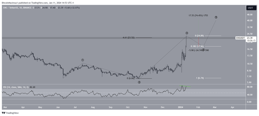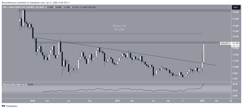 ENS 가격은 2022년 1월 이후 장기 하강 저항 추세선 아래로 떨어졌습니다. 이 하락으로 2023년 10월에는 6.65달러까지 떨어졌습니다. 이후 ENS 가격은 상승하여 지난 2주 동안 상승 속도가 크게 빨라졌습니다 .