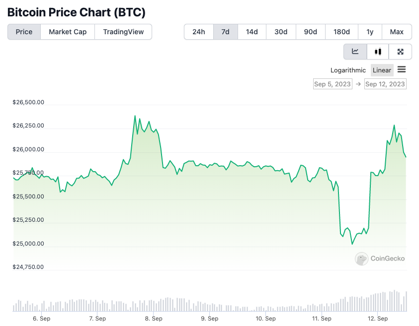 12일 비트코인은 전날 대비 3% 상승해 2만 6000달러대에서 거래되고 있다. 전날 하락분을 모두 회복했다.