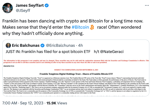 제임스 세이파트 블룸버그 애널리스트는 “(프랭클린 템플턴은) 오랫동안 비트코인과 암호화폐 업계에 관여해 왔다”며 “(이번 ETF 신청은) 기업의 관심사와 일치한다”고 의견을 내놓았다.