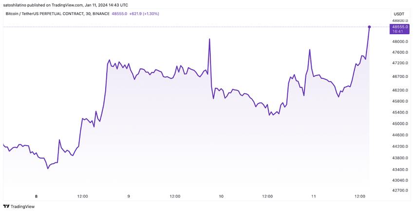 이는 비트코인 ETF 현물 거래가 시작된 지 30분 만에 총 12억 달러의 거래량을 기록하면서 분명하게 드러났습니다. 수요 증가로 인해 비트코인 가격은 48,555달러로 상승했으며, 이는 2021년 12월 말 이후 최고치입니다.