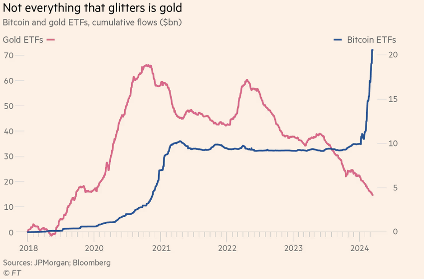 최근 금융 시장의 발전으로 인해 투자자들이 금 상장지수펀드(ETF)에서 비트코인 ETF로 자산을 옮기고 있는지에 대한 논쟁이 벌어지고 있습니다.