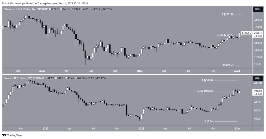 피벗 레벨을 보면 SOL과 이더리움은 비슷하게 되돌아갔습니다. 둘 다 0.382 피보나치 되돌림 저항 수준에 근접해 있습니다.