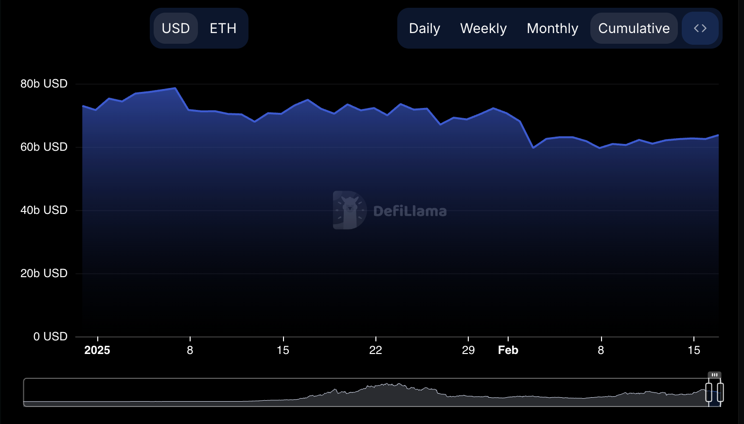 한편, 이더리움 TVL은 증가하고 있으며, 2월 2일에 596억 6천만 달러에서 2월 16일까지 637억 달러로 상승했습니다.