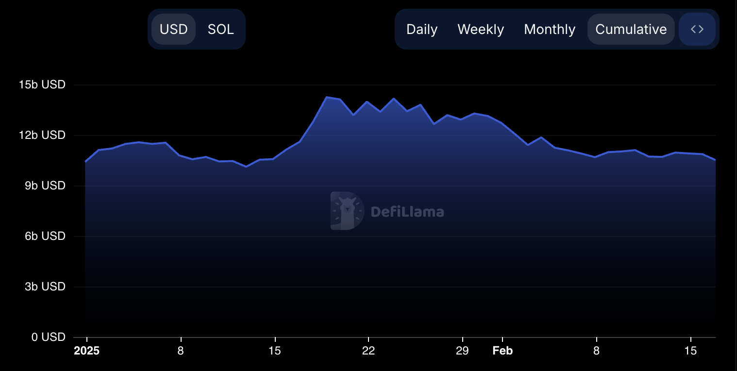 이 추세는 두 체인의 총예치량(TVL)에서도 반영됩니다. 솔라나의 TVL은 1월 18일에 142억 달러로 정점을 찍었지만, 그 이후로 꾸준히 감소하고 있습니다.