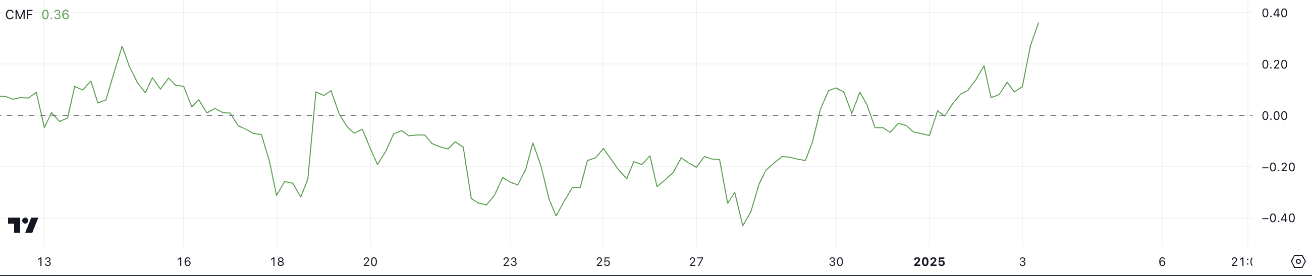 CMF는 가격과 거래량을 기반으로 자산에 대한 자금 흐름을 측정하는 모멘텀 지표입니다. 0 이상의 값은 순매수 압력을, 0 이하의 값은 순매도 압력을 나타냅니다.