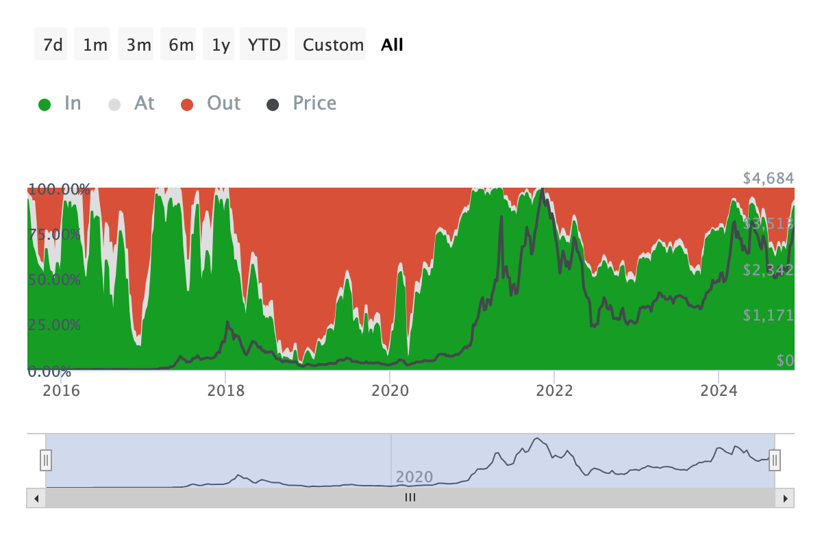 그러나 이더리움의 경우, 이익을 보는 보유자의 비율이 증가했습니다. 이 증가는 더 많은 참가자가 알트코인을 구매하거나 ETF에 투자하도록 유도할 수 있음을 시사합니다. 이 추세가 계속된다면 ETH의 가치를 더 높일 수 있습니다.