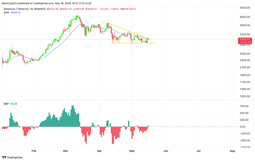 위에서 평가한 지표는 이더리움 시장에 강세 활동이 있음을 시사하지만, 일봉 차트에서 평가한 가격은 하강 삼각형 안에 머물러 있다는 점에 주목할 필요가 있습니다. 이는 일반적으로 약세 신호로 간주됩니다.