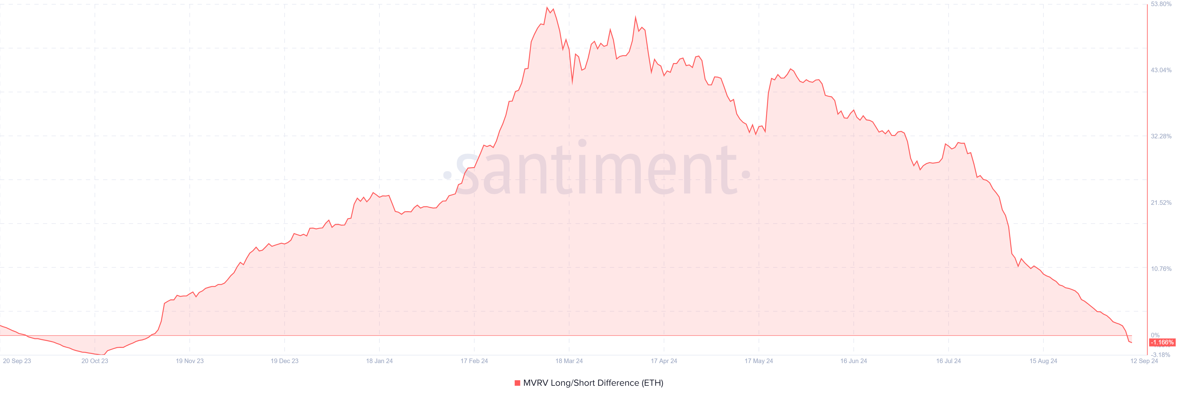 MVRV 장단기 차이 지표는 이더리움의 현재 시장 상황에 대한 중요한 통찰을 보여줍니다. 2023년 11월 이후 처음으로 이 지표는 부정적 영역으로 떨어져 10개월 만에 최저치를 기록했습니다.