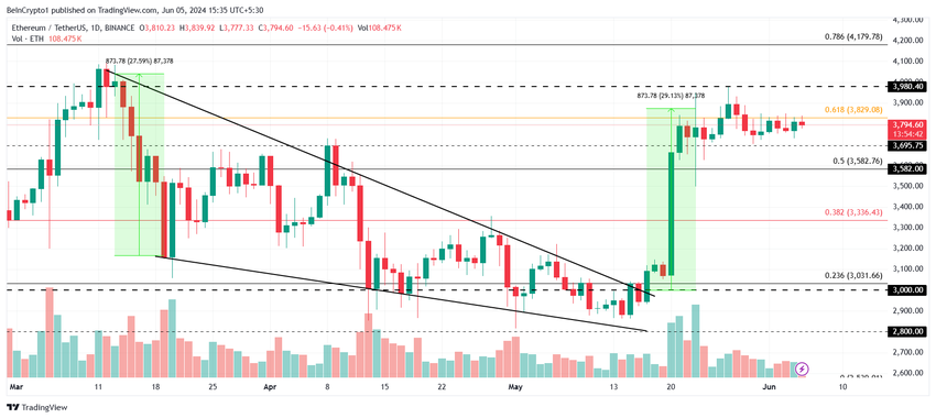 이더리움 가격은 3주 동안 61.8% 피보나치 되돌림선인 3,829달러 아래에 머물러 있습니다. 이 선은 강세장 지지선이라고도 하며, 이 선을 유지하면 상승할 수 있습니다.