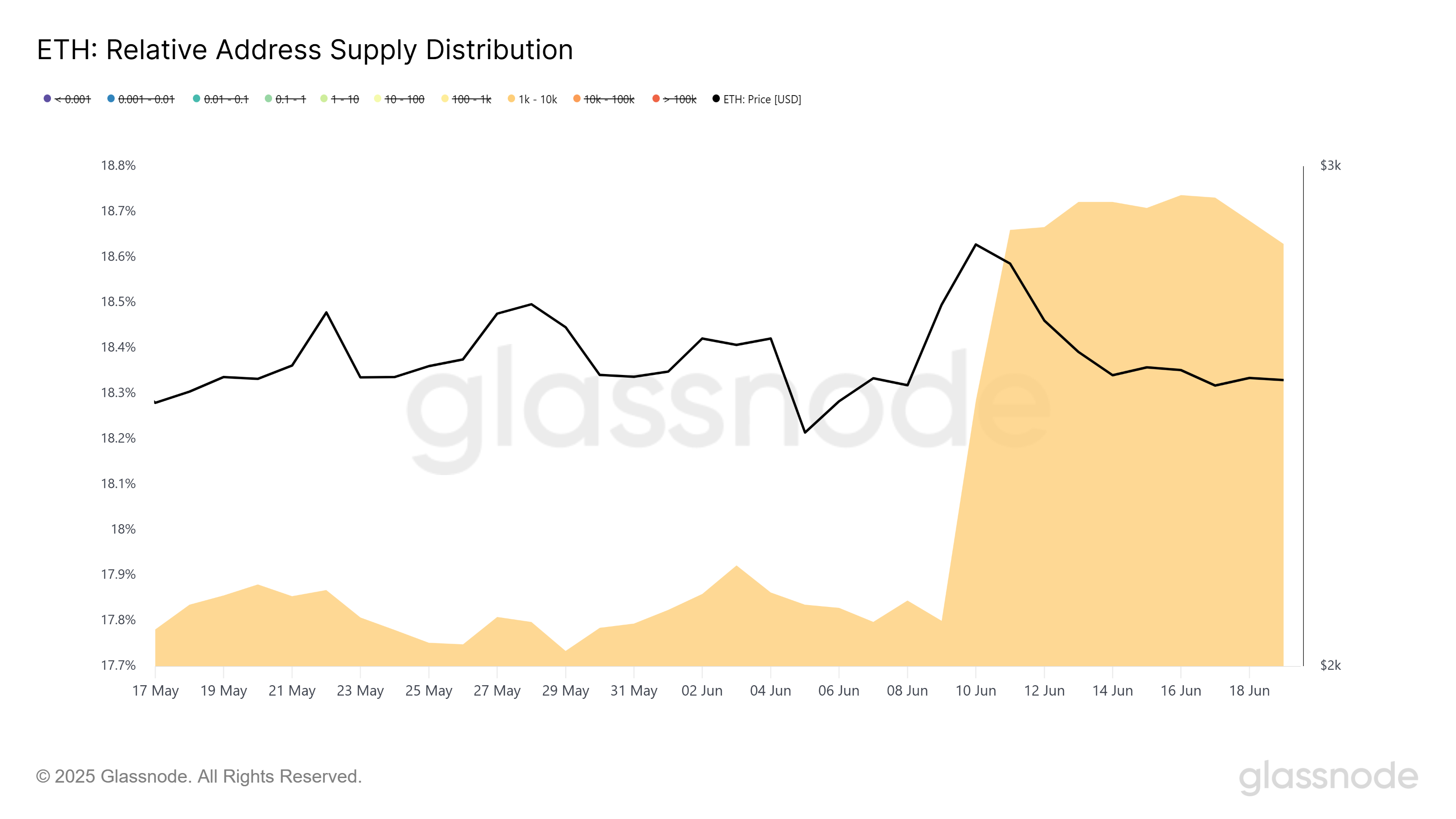 이더리움의 거시적 모멘텀도 긍정적인 신호를 보이고 있습니다. 최근 고래 활동의 급증은 특히 주목할 만한 발전입니다. 1000에서 1만 ETH를 보유한 주소는 보유량이 급증하여 1430만 ETH, 즉 총 유통량의 약 18.6%에 이르렀습니다.