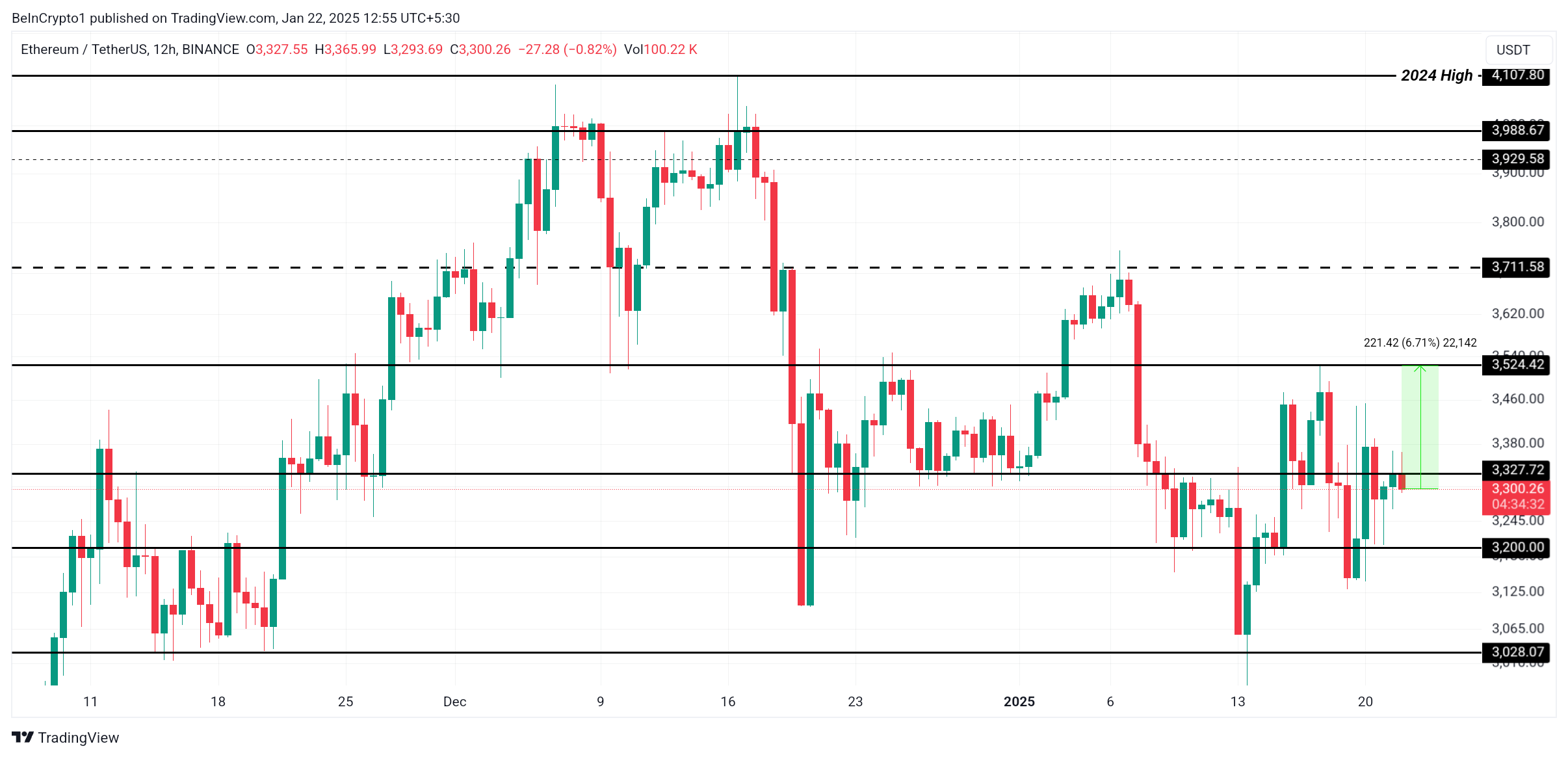 이더리움은 현재 3300달러 근처에서 거래되고 있으며, 중요한 저항 수준인 3,327달러 바로 아래에 있습니다. 이를 지지선으로 전환하는 것이 ETH가 3524달러로의 랠리를 시작하는 데 필수적이며, 이는 현재 수준에서 6% 증가를 나타냅니다. 이 움직임은 최근 손실에서 부분적인 회복을 의미합니다.
